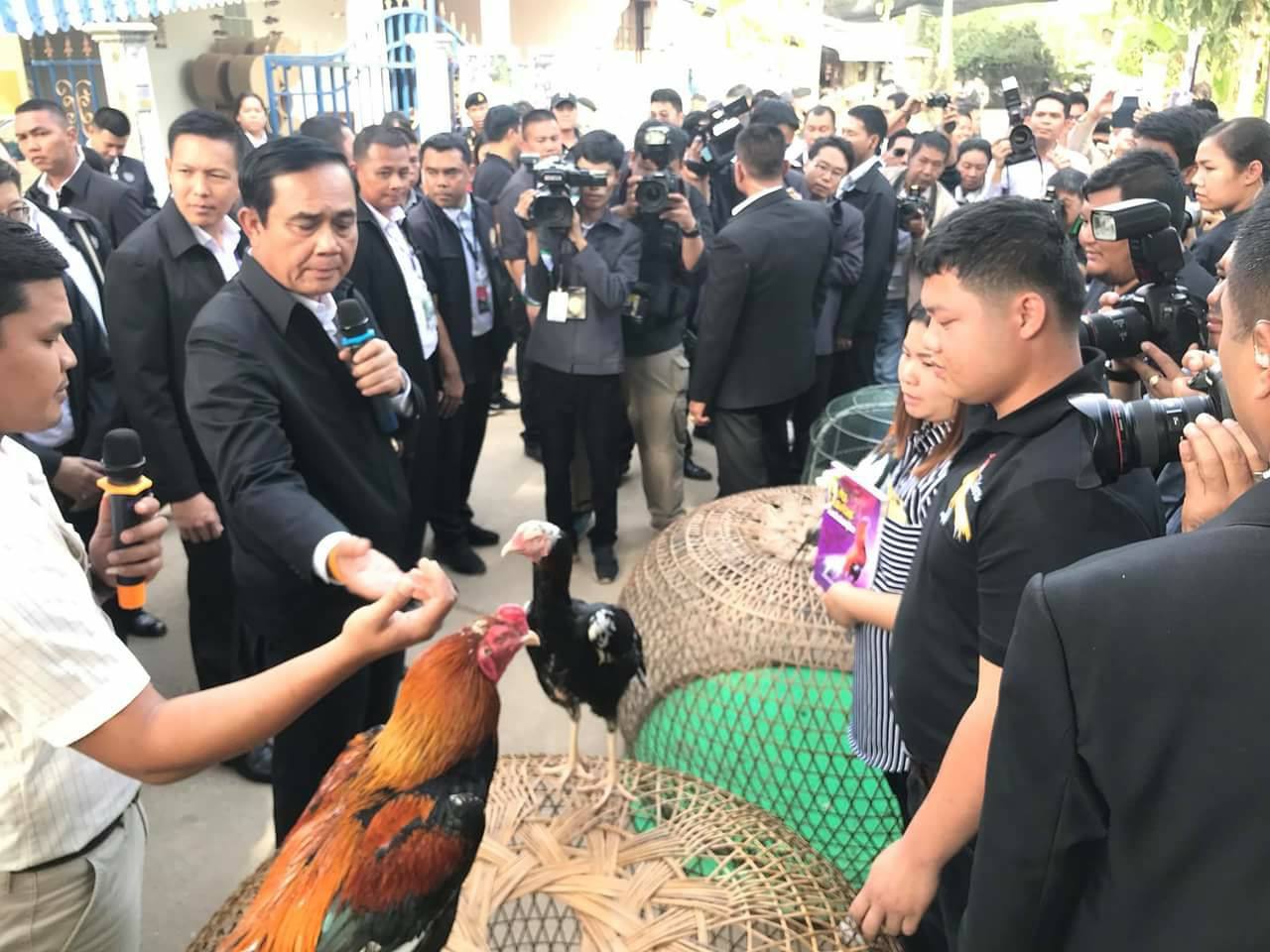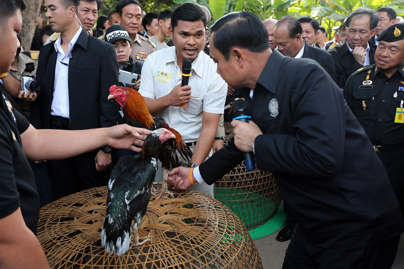 และจากนั้นนายกรัฐมนตรี ได้เยี่ยมชมไก่ชน สายพันธ์พื้นเมืองของจังหวัดพิษณุโลก หรือไก่ชนสมเด็จพระนเรศวร คือ “ไก่เหลืองหางขาว” ซึ่งเพิ่งได้รับรางวัลมา พร้อมลองอุ้มไก่ชนชื่อ “เทพประทานพร” และยังให้ความสนใจกับไก่ชนเหลืองหางข่าวพันธุ์วชื่อ ‘เจ้ามารวย’ ซึ่งมีราคากว่า 100,000 บาท เนื่องจากมีคุณลักษณะสมบูรณ์แบบไหล่กว้างบึกบึน แข้งมังกร ปัจจุบันไก่พันธุ์เหลืองหางขาวได้รับความสนใจจากชาวต่างประเทศมาขอซื้อลูกไก่ไปเลี้ยงจำนวนมากทั้งมาเลเซีย อินโดนีเซีย ลาว รวมทั้งบรูไน โดยนายกรัฐมนตรีได้พูดกับไก่ชนเทพประกายทอง พร้อมเกาคอว่า “ไม่ต้องกลัว คสช. นะ คสช. ไม่ดุ”